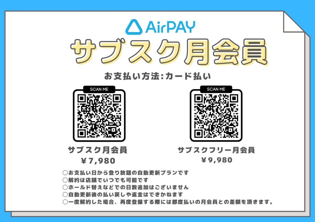 通常の月会員は店頭での都度払いとなります。